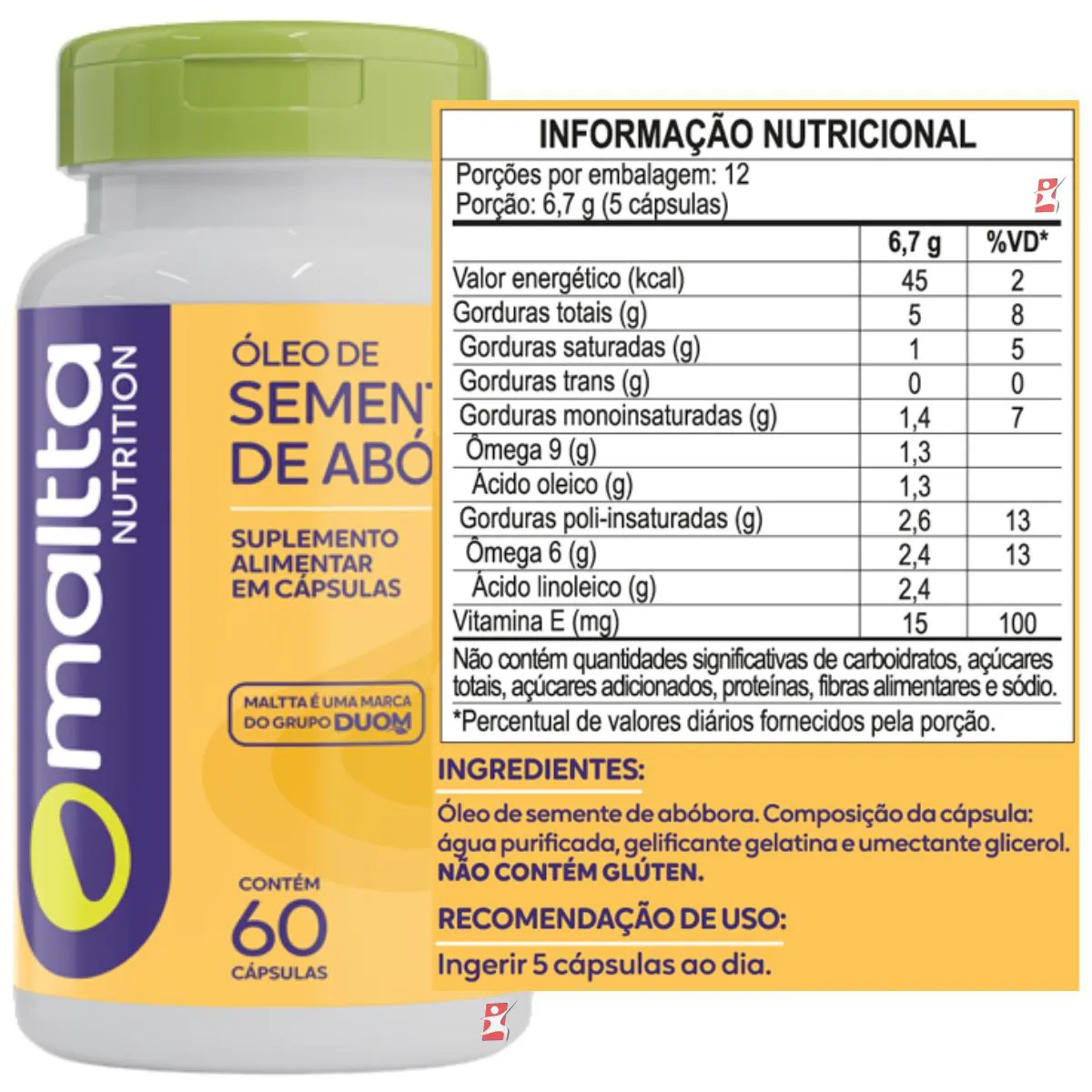 Óleo de semente de abóbora. Composição da cápsula: agua purificada, gelificante gelatina água e umectante glicerol. NÃO CONTÉM GLÚTEN.