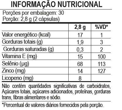 Óleo de semente de abóbora, licopeno sintético, maltodextrina, bisglicinato de zinco, acetato de DL-alfa-tocoferol, L-Selenometionina, emulsificante lecitina e antiumectante dióxido de silício. Composição da cápsula: água purificada, gelificante gelatina, umectante glicerol, estabilizante cera de abelha, corantes dióxido de titânio, azorrubina e vermelho allura Ac. ALÉRGICOS: CONTÉM DERIVADOS DE SOJA E PODE CONTER PEIXE. NÃO CONTÉM GLÚTEN.